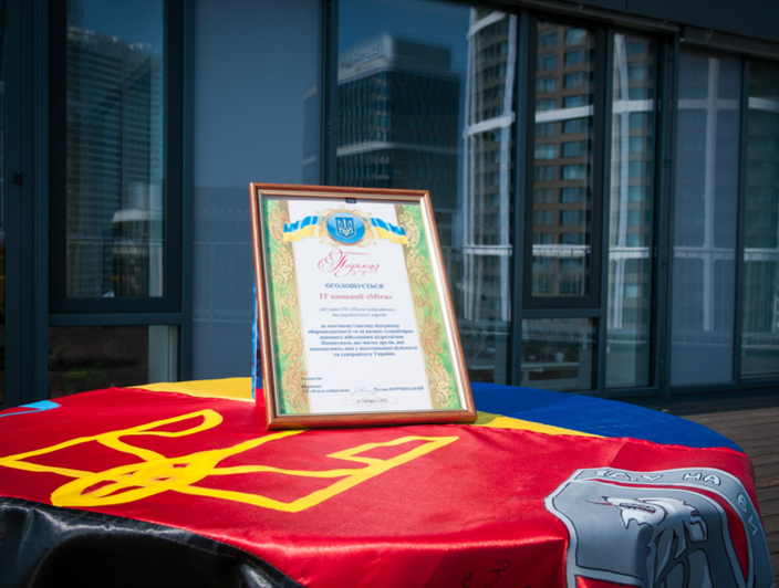 Preklad textu ďakovacej listiny: „Poďakovanie sa oznamuje IT spoločnosti <<Sféra>> od charitatívnej organizácie <<Bratské rameno>>, aj od ukrajinského národa za včasnú a výraznú podporu obranyschopnosti a za humanitárnu pomoc poskytnutú obranným jednotkám. Sme pyšní na to, že máme priateľov, ktorí nám pomáhajú brániť celistvosť a suverenitu Ukrajiny.“